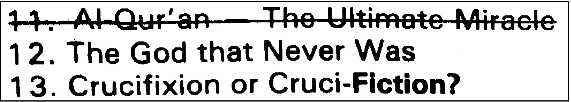 Because the Source of the Arabic texts of the Qur’ans is the ‘Oral Tradition’ (ancient and modern!), obviously, Islam isn’t copying the manuscripts AT ALL - in fact it is trying to ignore them! It is also obvious that Islam is going the wrong way! The manuscript source of ‘Proof’ for the ‘eternal’ Arabic text of the Qur’an is lost and the ‘Oral Tradition’ disagrees to the extent that it declares the manuscripts should say ‘YES’ not ‘NO’. It is ironic, then, to find Mr. Deedat mocking concerning the Bible’s ever increasing dependency upon older and older manuscripts saying: "The Qur’an Is No More The ULTIMATE MIRACLE" When confronted with the evidence of errors and alterations in the Qur’an, the followers of Islam seem only to cry, "But the Bible contains 172 |