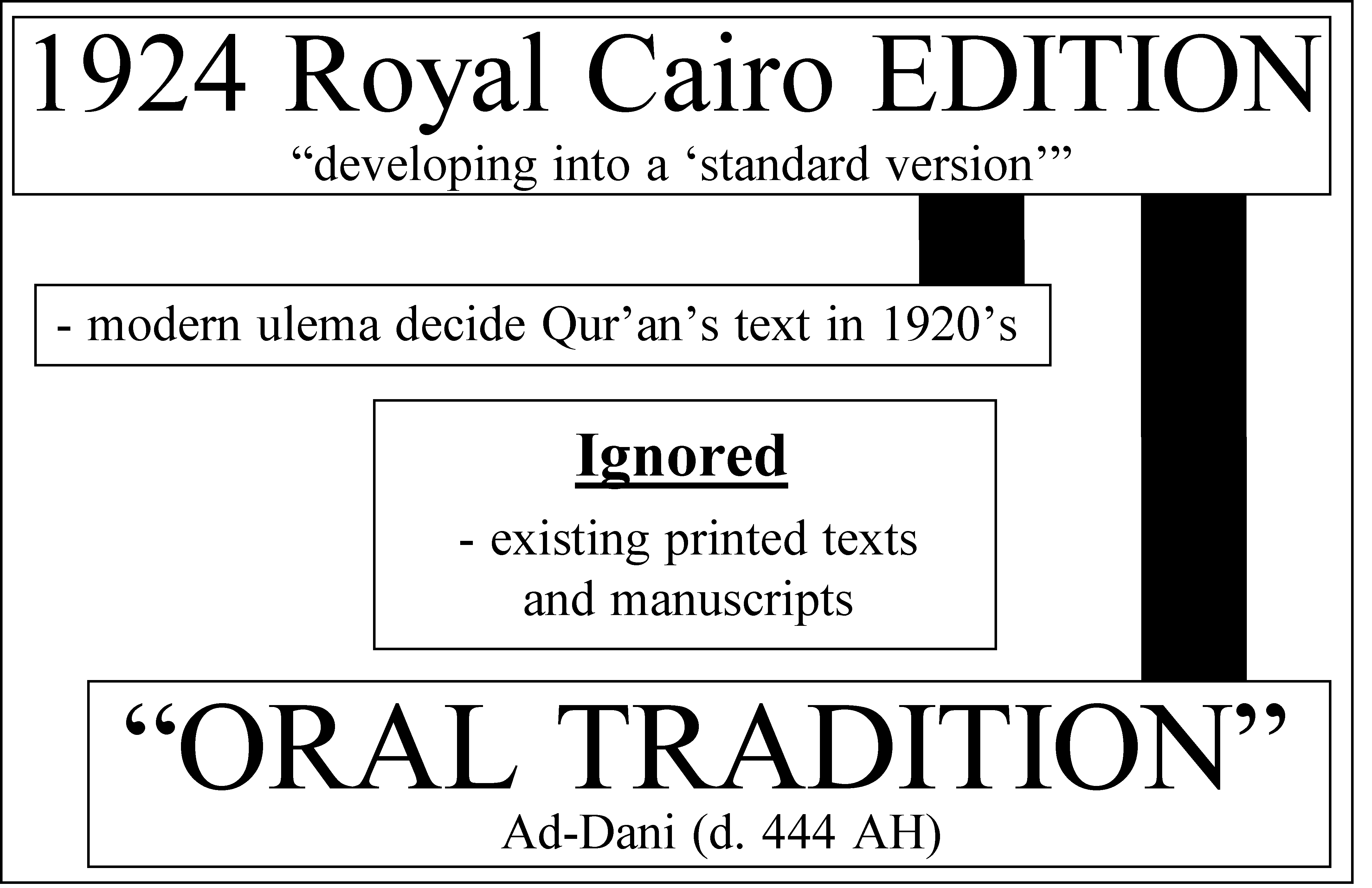 Islam thus admits its rejection not only of the ‘most ancient’ manuscript copies, and not only of the manuscripts and printed Arabic Qur’ans of the recent centuries, but even the early ‘Oral Tradition’! "TAKE YOUR OWN QUR’AN AND COMPARE!!" This chart shows the total dependency upon the ‘Oral Tradition’ and the modern ulema.