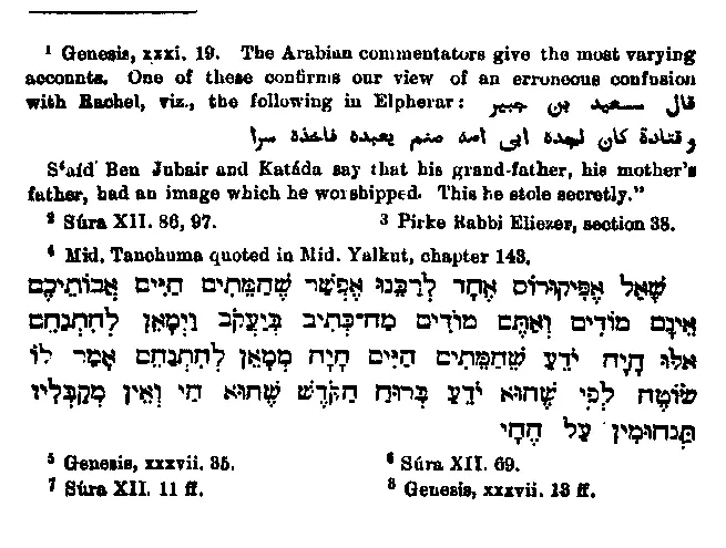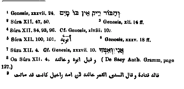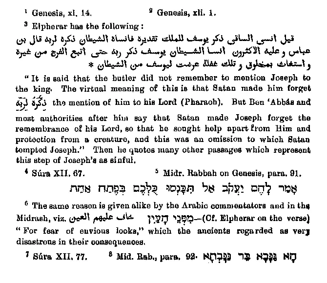 who was present at what occurred between Joseph and the woman, and some of the commentators quoted in Elpherar express themselves quite in harmony with the Sepher Hayyashar as follows:1 "Sa'id Ben Jabair and Dhubak say it was a child in the cradle which God permitted to speak. This is the tradition of the Uphite commentator according to 'Abba's." In the Sepher Hayyasbar it is also asserted that there was present a child of eleven months who till then could not talk, but then attained to speech. But there is a difference in that the Jewish book makes the child confirm the utterance of Joseph, while the Arabic commentator puts into its mouth the decision about the rent clothing, while other Arabic writers reject as highly unsuitable. Many commentators say that this was no child,2 but rather a wise man full of penetration. It follows from this that Muhammad either mired the two legends inappropriately, or else that the second one came later into Arabic tradition and was read by the Arabs into the words of the Quran. The words3 which Wahl translates: "But the devil would not allow it4 that he (the cap-bearer) thought of him (Joseph)," are explained by the following passage:5 "The talk of the lips tendeth only to penury,6 because although Joseph reminded the