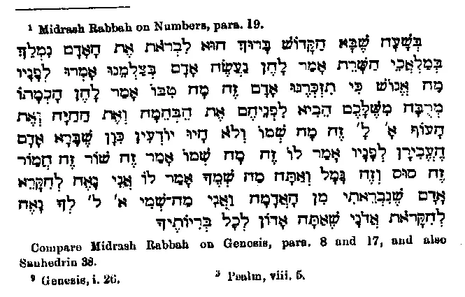 The corresponding Hebrew passage may be thus translated:1 "When the Holy One, blessed be He! would create man, he took counsel with the angels, and said to them: 'We will make man in our image;'2 then they said: 'What is man that thou art mindful of him?3 What will be his peculiarity?' He said: 'His wisdom is greater than yours.' Then He brought beasts, cattle, and birds before them, and asked for their names, but they knew them not. But when He had