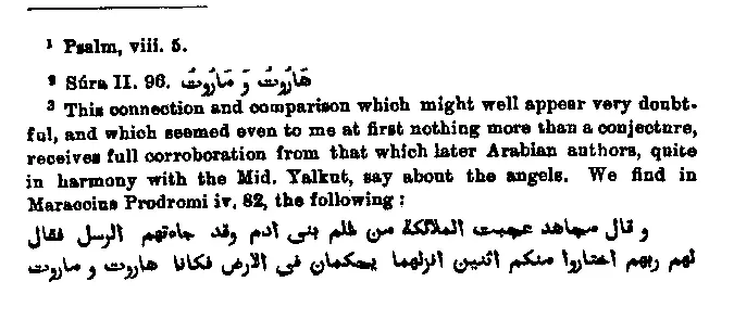 O Holy one! then God permitted sleep to fall on him, and all knew that he was of earth." In favour of the Christian origin of this narrative we must count the fact that the name used by Christians for the devil is the one used in all the passages referred to instead of the general Hebrew name.1 From this event according to Muhammad arises the hatred of the Devil against the human race, because on their account he became accursed of God; and so his first work was to counsel man in the Garden of Eden2 to eat of the tree of knowledge.3 In this narrative the Devil is again given his Hebrew name,4 and yet the first explanation of the temptation through the snake as coming from the Devil seems to be entirely Christian, as no such reference is to be found in the older Jewish writings; the passage quoted below can only be regarded as a slight allusion:5 "From the beginning of the book tip to this point6 no Samech is to be found; as soon however as woman is created, Satan (with the initial letter Sin like Samech) is created also." Still we find in a book which, though forged, is undoubtedly old,7 the following statement: