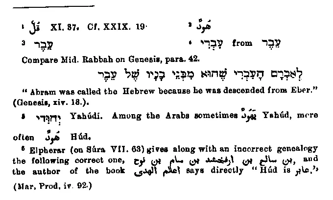 After Noah the next mentioned is Hud2 who is evidently the Biblical Eber.3 This seems a striking example of the ignorance of Muhammad, or, as it appears to me more probable here, of the Jews round about him. According to the Rabbinical opinion4 the name Hebrew is derived from Eber, but in later times this name was almost entirely forgotten and the name Jew5 was commonly used. The Jews, to whom it was known that their name was derived from an ancestor, believed that the name in question was that in use at the time, and that the ancestor therefore was this patriarch Hud.6 His time is that in which a second punitive judgment from God on account of bold, insolent behaviour is mentioned in the Scripture,