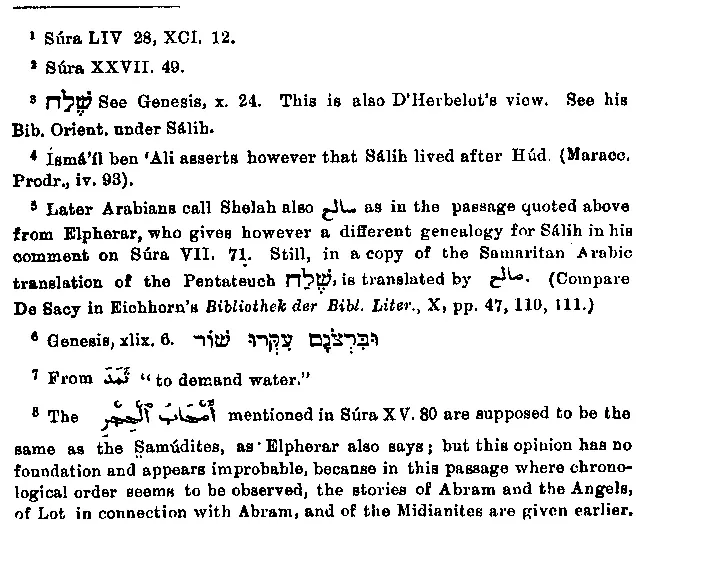 he even bade them share water with her.1 But the unbelievers of his time (according to one passage2 only nine in number) hamstrung her and so divine punishment overtook them. I find no similar occurrence in Jewish writings, but the likeness of the name points to Shelah3 who however, as the father of Eber, would have deserved mention before him.4 On the whole, the word is so general in its meaning of "a pious man" that we cannot treat it here with certainty as having been originally a proper name.5 Perhaps the story of the houghing is founded on the words in Jacob's blessing of his sons6, and the sharing of the water on the etymology of the name Samud.7 Moreover Sumud was, according to the commentators the son of Getter the son of Aram, the son of Shem, the son of Noah, which fits in fairly well with the date already assigned to Shelah.8 It is however impossible