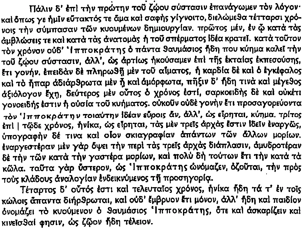 But let us take the account back again to the first conformation of the animal, and in order to make our account orderly and clear, let us divide the creation of the foetus overall into four periods of time. The first is that in which. as is seen both in abortions and in dissection, the form of the semen prevails (Arabic nutfah). At this time, Hippocrates too, the all-marvelous, does not yet call the conformation of the animal a foetus; as we heard just now in the case of semen voided in the sixth day, he still calls it semen. But when it has been filled with blood (Arabic alaqa), and heart, brain and liver are still unarticulated and unshaped yet have by now a certain solidarity and considerable size, this is the second period; the substance of the foetus has the form of flesh and no longer the form of semen. Accordingly you would find that Hippocrates too no longer calls such a form semen but, as was said, foetus. The third period follows on this, when, as was said, it is possible to see the three ruling parts clearly and a kind of outline, a silhouette, as it were, of all the other parts (Arabic mudghah). You will see the conformation of the three ruling parts more clearly, that of the parts of the stomach more dimly, and much more still, that of the limbs. Later on they form "twigs", as Hippocrates expressed it, indicating by the term their similarity to branches. The fourth and final period is at the stage when all the parts in the limbs have been differentiated; and at this part Hippocrates the marvelous no longer calls the foetus an embryo only, but already a child, too when he says that it jerks and moves as an animal now fully formed (Arabic a new creation) ...