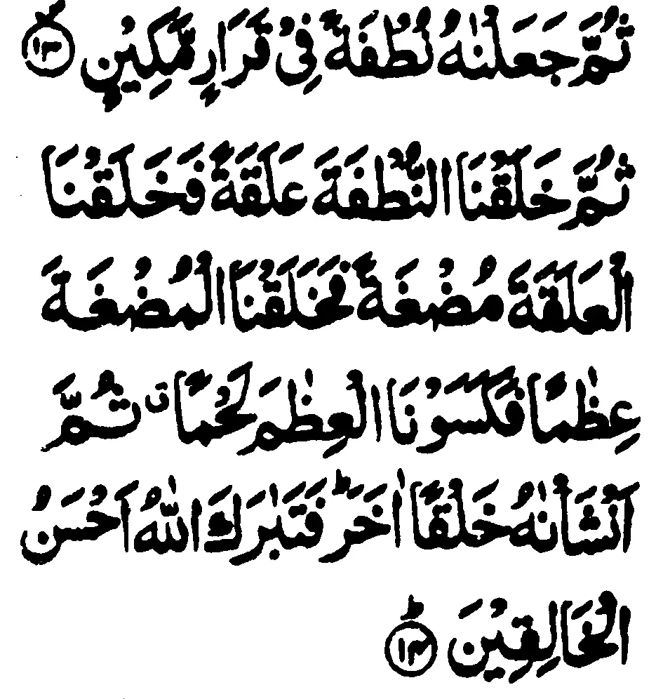 "Thereafter We made him (the offspring of Adam) as a Nutfah (mixed drops of the male and female sexual discharge and lodged it) in a safe lodging (womb of the woman). Then We made the Nutfah into a clot (Alaqa, a piece of thick coagulated blood), then We made the clot into a little lump of flesh (Mudghah), then We made out of that little lump of flesh bones, then We clothed the bones with flesh, and then We brought it forth as another creation. So blessed be Allah, the Best of Creators!"