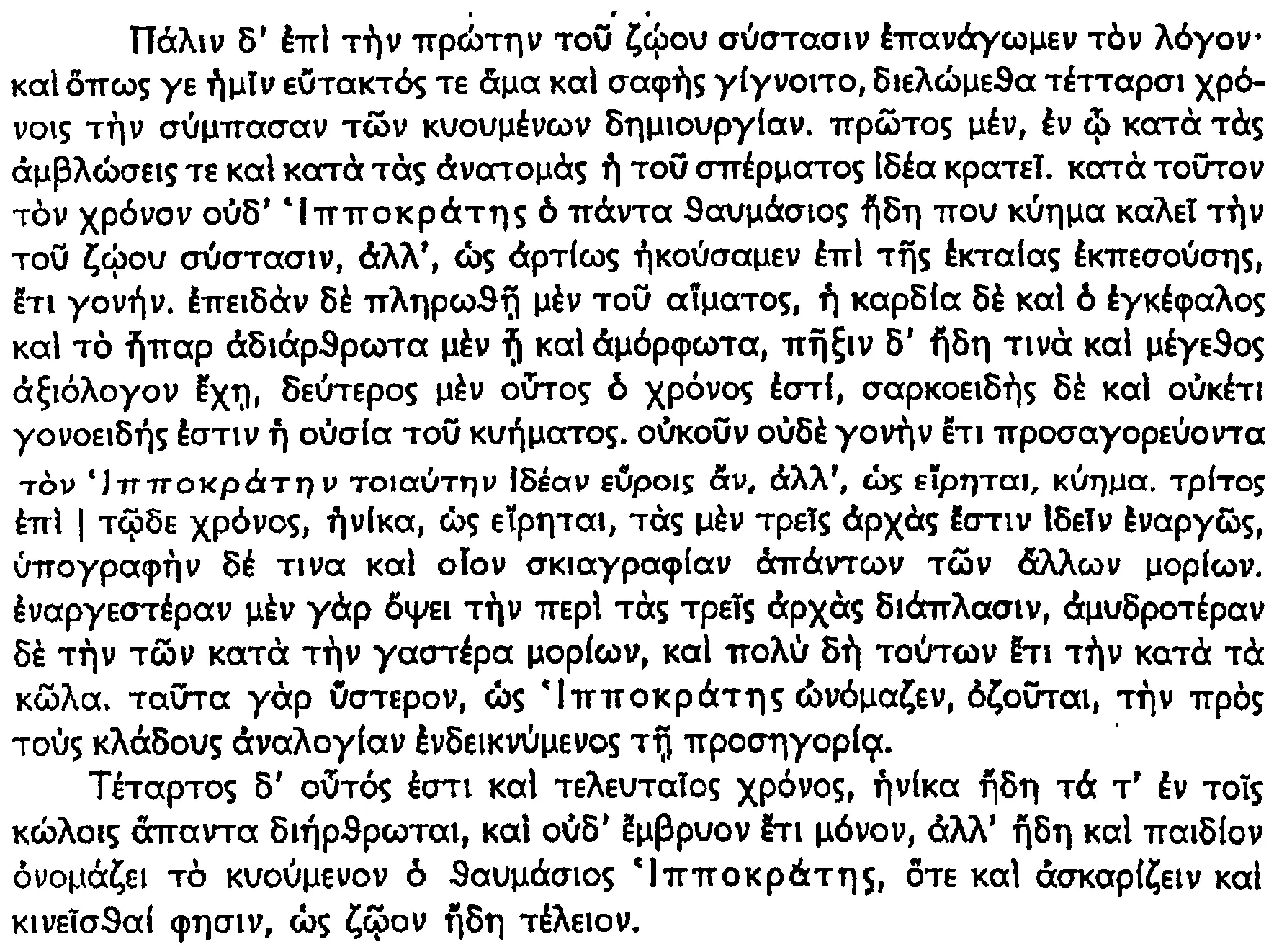 "But let us take the account back again to the first conformation of the animal, and in order to make our account orderly and clear, let us divide the creation of the foetus overall into four periods of time. The first is that in which, as is seen both in abortions and in dissection, the form of the semen prevails (Arabic nutfah). At this time, Hippocrates too, the all-marvelous, does not yet call the conformation of the animal a foetus; as we heard just now in the case of semen voided in the sixth day, he still calls it semen. But when it has been filled with blood (Arabic alaqa), and heart, brain and liver are still unarticulated and unshaped yet have by now a certain solidarity and considerable size, this is the second period; the substance of the foetus has the form of flesh and no longer the form of semen. Accordingly you would find that Hippocrates too no longer calls such a form semen but, as was said, foetus. The third period follows on this, when, as was said, it is possible to see the three ruling parts clearly and a kind of outline, a silhouette, as it were, of all the other parts (Arabic mudghah). You will see the conformation of the three ruling parts more clearly, that of the parts of the stomach more dimly, and much more still, that of the limbs. Later on they form "twigs", as Hippocrates expressed it, indicating by the term their similarity to branches.