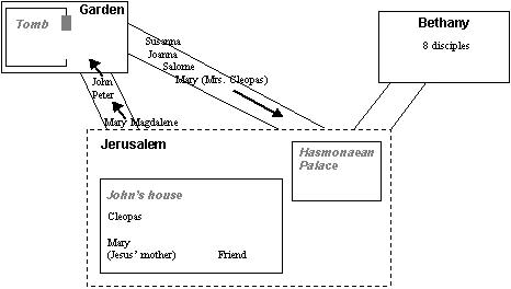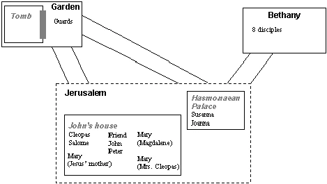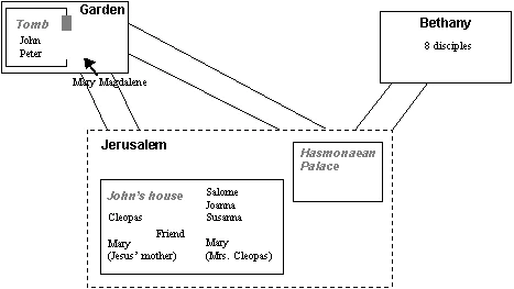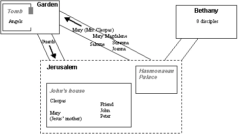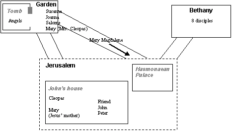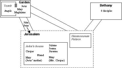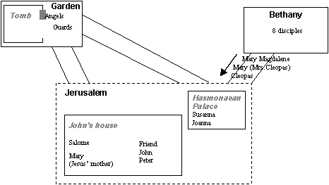 As they ran along the road to Bethany, there occurred the meeting with Jesus that is reported by Matthew (28:8-10). Why is Matthew alone in reporting this meeting? For Peter and John in Jerusalem, only Mary Magdalene would have come and spoken of having met Jesus, and thus this is what we find written in John's gospel and that of Mark (reporting Peter); see John 20:18 and Mark 16:10. Peter, unlike John, did not yet believe (John 20:8) and so Mark's gospel naturally reflects an unbelief in Mary's news (Mark 16:10). Matthew, who received the news after waiting in Bethany, naturally telescoped the women's meetings with the angels and with Jesus - for this would have been how the women reported the events to him, as they excitedly blurted out all that they had seen and heard. The only slight puzzle is Luke, who records neither encounter with Jesus. Two points need making here; firstly, Luke in his chronological account mentions neither the men's visit to the tomb nor the appearance to Peter himself - yet he clearly refers to both in later reported speech (Luke 24:24,34) so it is obvious that Luke did not intend to imply that his report was complete. Secondly, there is no point in his narrative where he could insert either incident without spoiling the drama of realisation on the Emmaus road and the crescendo of the unmistakable appearance in Luke 24:36. Thus Luke 24:9-12 are a general summary, indicating the main characters and the general atmosphere of unbelief that prevailed. Both Mary Magdalene and the others had seen angels and were generally disbelieved, so what he actually says is true if incomplete.