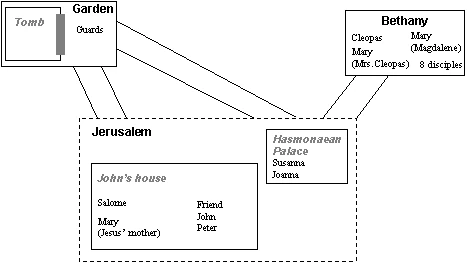 Cleopas remains at John's house, whilst the two Marys, along with Salome, have called for Joanna and Susanna. The five women now head for the tomb to do the women's work of anointing the body. Meanwhile, the guards have recovered and are running back to tell the authorities of their experience. The angels are waiting inside the tomb. |