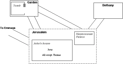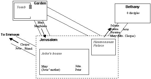 Two other people had also set out from John's house in south Jerusalem. Jesus' uncle Cleopas, having been told of the angels from the group of women (which included his own wife, Mary) set out with a companion to go to Emmaus. Whilst on the road they had the famous encounter that Luke has recorded in Luke 24:13-32. The information given by Cleopas in verses 22-24 exactly match what he would have known in this reconstructed account; he would have known of the women's encounter with two men in white, and of Peter and John's experience of discovering the tomb empty. But he and his companion would have set out before Mary Magdalene had returned with the news of having actually seen and spoken to Jesus, and thus neither Cleopas or his friend would have had any idea that Jesus was risen and alive.