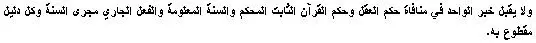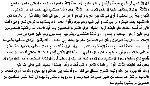 The non-poetic sources include either the Blessed Book of our Lord, the purest, the most fluent and the most eloquent piece of Arabic literature, citations therefrom are accepted to be authoritative, whether they are from its continual [most well known] tradition or from its irregular [not so well known] traditions, as has been declared by Ibn Janni in the beginning of his book "Al-Mohtasib". Besides [the Qur'an] such [non-poetical] sources include [speech] references from the first three categories of Arabs, as we have mentioned in the categorization of poets, above. As far as citations from the Hadith (narrative traditions) of the prophet are concerned, Ibn Malik accepts them as authoritative... while, Ibn Dhai` and Abu Hayyan refuse to do so. Their refusal is based on two reasons: (1) these traditions are not verbal narrations of the speech of the prophet, rather only their content has been narrated [in the words of the narrators]. And (2) the great grammarians of Basra and Kufa do not hold them as citable authorities [in the derivation of Grammatical rules].